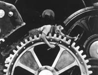 Chaplins Auseinandersetzung mit der modernen Welt, in der sich ein Arbeiter durchs Leben schlägt, unter einer entmenschlichten Maschinerie des Fordismus leidet und buchstäblich in die Mühlen des Kapitalismus gerät. In völlig anachronistischer Weise noch 1936 als Stummfilm mit Toneffekten gedreht.