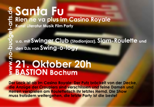 Swinger Club spielen Welthits als Jazz, die Lesungen finden in Form eines Slam-Roulettes statt, die Party bestreiten die DJs von Swing-o-logy mit originalem Swing. Holger Ehrich und Deana Kozsey vom Duo Diagonal führen als Gastgeber durch den Abend. Als Chef-Croupier am Roulettetisch: Sigi Gerk!